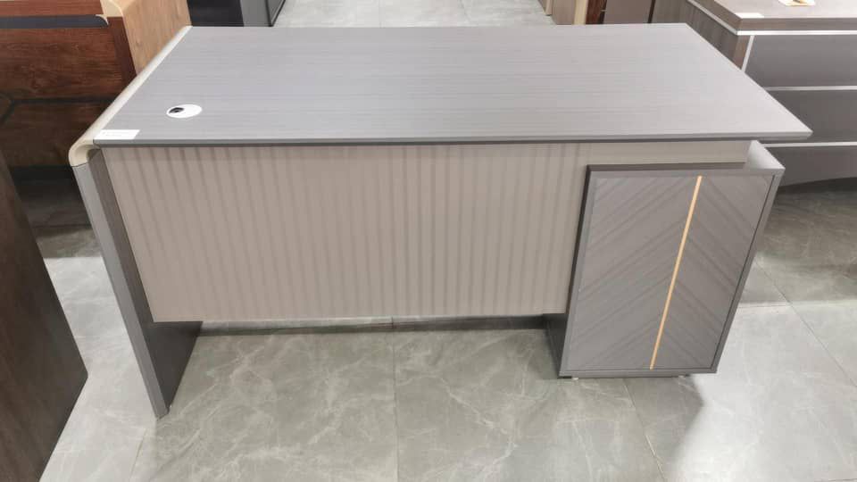 Ce bureau se distingue par son design bicolore audacieux, son motif rainuré texturé sur la façade et le retour, et son plateau spacieux au fini mat. Il ne s'agit pas seulement d'un meuble, mais d'une déclaration de réussite qui inspire respect et concentration.