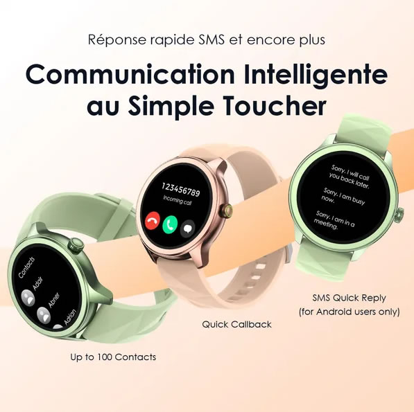 Au simple toucher, une réponse rapide avec un message personnalisé sera envoyée lorsque vous raccrochez un appel entrant. oraimo Watch 2R permet également un rappel rapide et permet d’ajouter jusqu’à 100 contacts