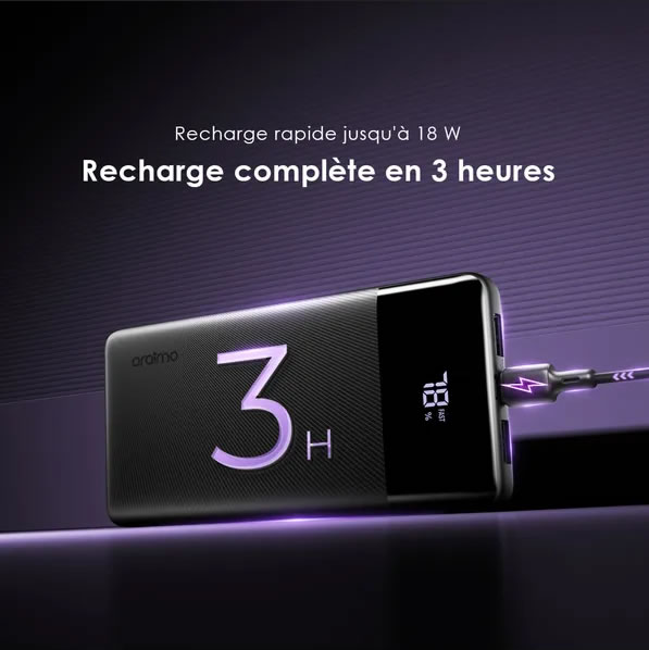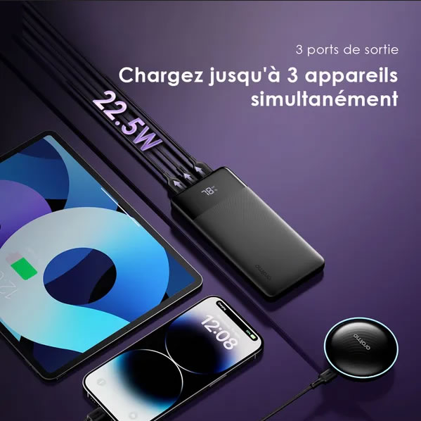 Le port Type-C offre une recharge rapide 22.5W pour vos appareils et une recharge accélérée 18W pour la batterie externe. Profitez d’une alimentation rapide dans les deux sens !